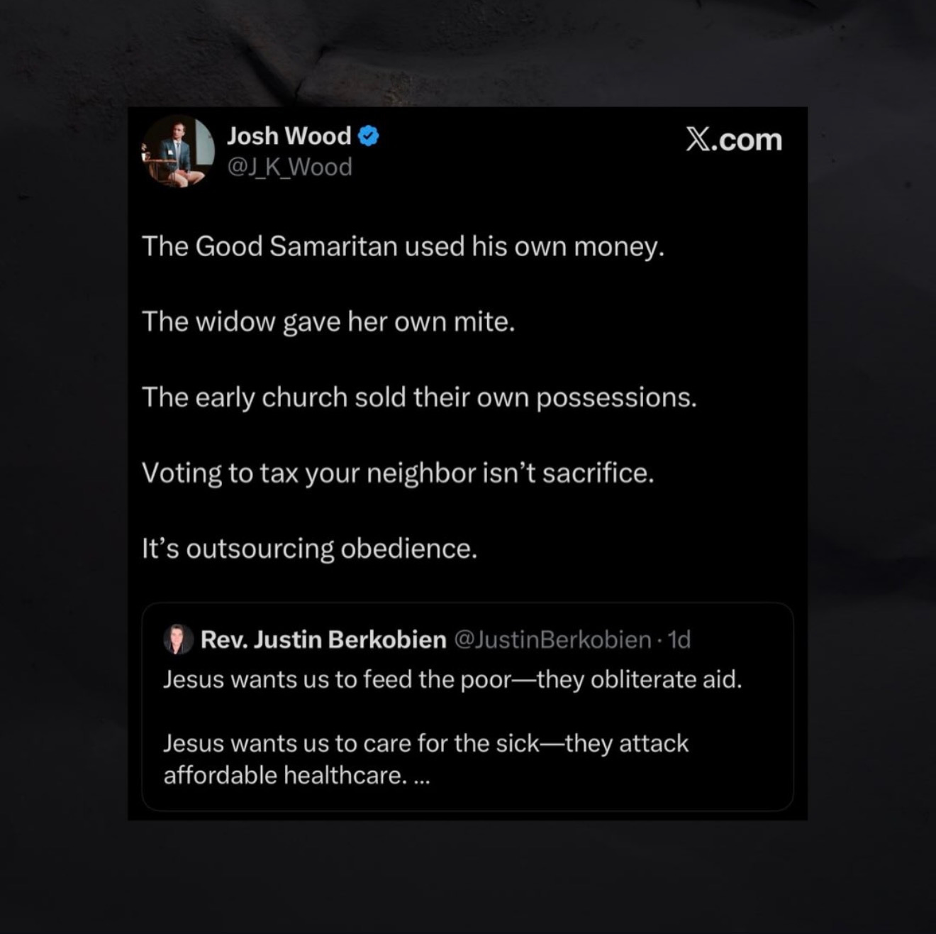 My response, if you can’t see the screenshots: “The Good Samaritan used his own money. The widow gave her own mite. The early church sold their own possessions. Voting to tax your neighbor isn’t sacrifice. It’s outsourcing obedience.”