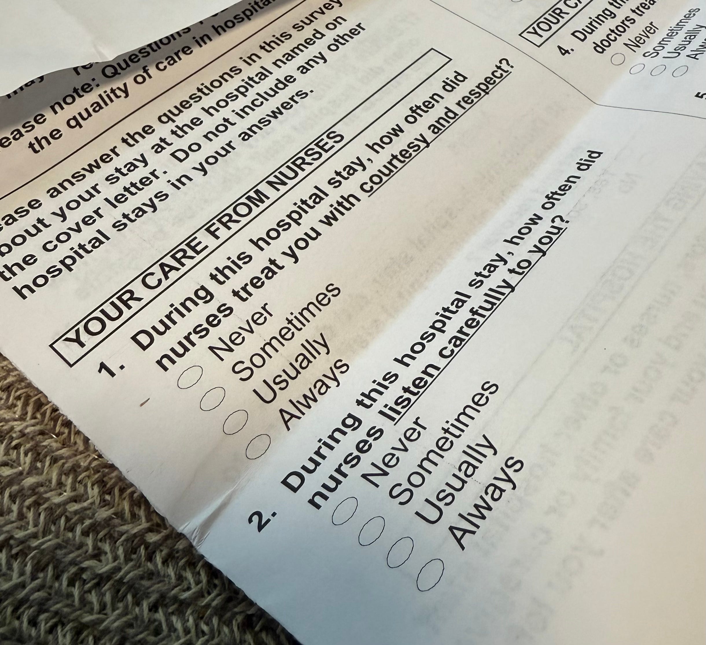 We just received our hospital survey in the mail this past week. The first question was: “During this hospital stay, how often did nurses treat you with courtesy and respect?”