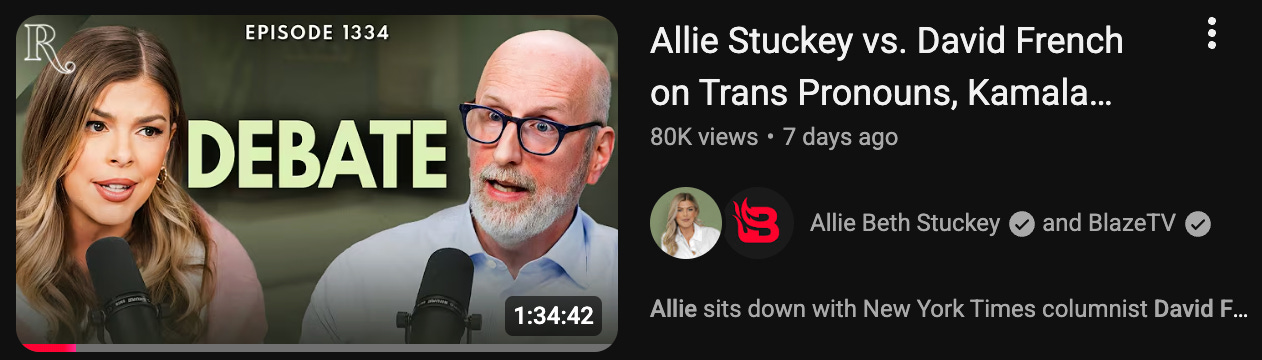 What has to be conceded will be conceded. President Trump’s personal life, role in removing the right-to-life plank from the Republican platform, and embrace of taxpayer-funded IVF is all horrific. I will not carry that policy water nor will I defend his sexual ethics. On those points French has an easy and obvious target.