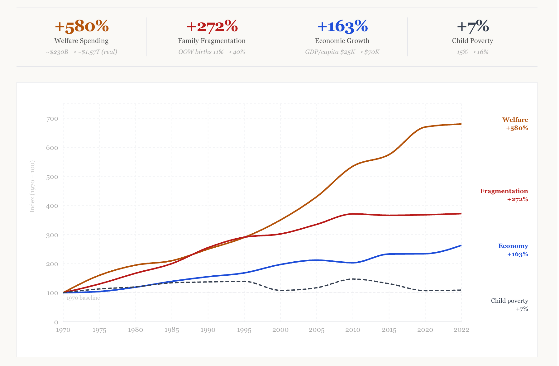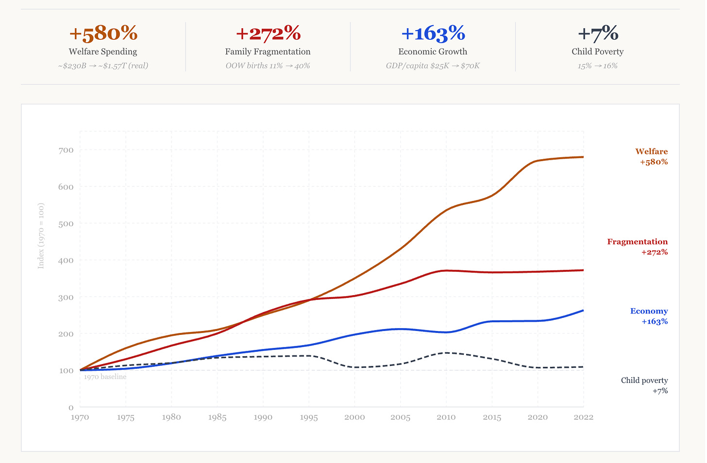 Look at the chart above. Four lines, each indexed to 1970, tell the whole story. Welfare spending rose 580 percent in real dollars, climbing from roughly $230 billion to $1.57 trillion a year in combined federal and state means-tested spending. Per-capita GDP grew 163 percent, from about $25,000 to more than $70,000. Out-of-wedlock births jumped from 11 percent of births to 40 percent, a 272 percent increase. And child poverty, the single number the war was declared to bring down, now sits seven percent higher than where it started.