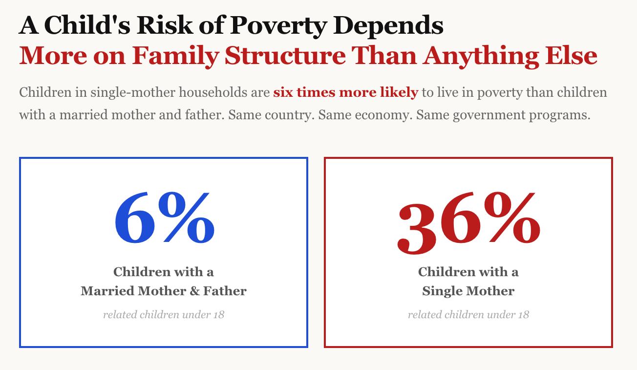 The child poverty rate in families headed by a single mother is 36 percent. The child poverty rate in families where a child’s mother and father are married is 6 percent. Same country. Same economy. Same transfer programs. The difference is whether a child’s parents are married to each other.