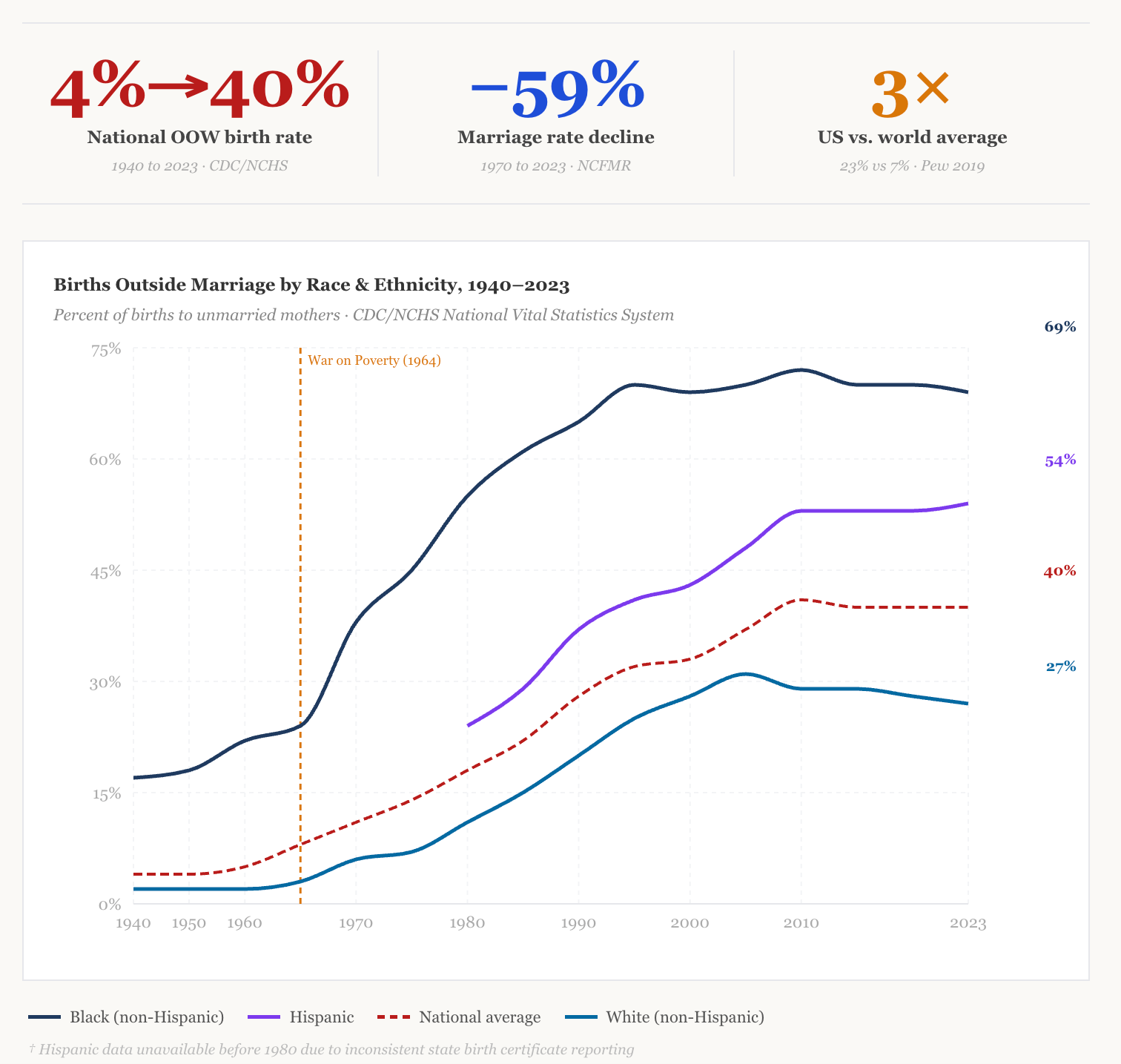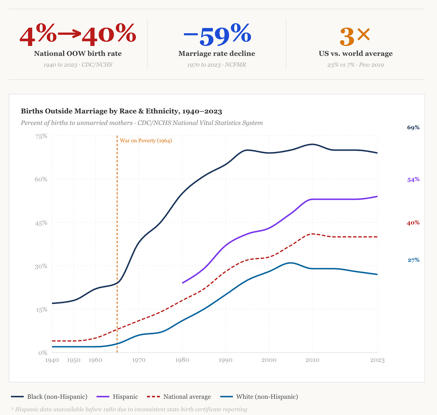 In 1970, 11 percent of children were born outside of marriage. Today that number is 40 percent. Nearly four in ten children now enter the world without a married mother and father in the home. The marriage rate itself has fallen 59 percent since 1970. The United States now has the highest rate of children in single-parent households of any nation on earth, according to Pew Research, more than triple the global average.