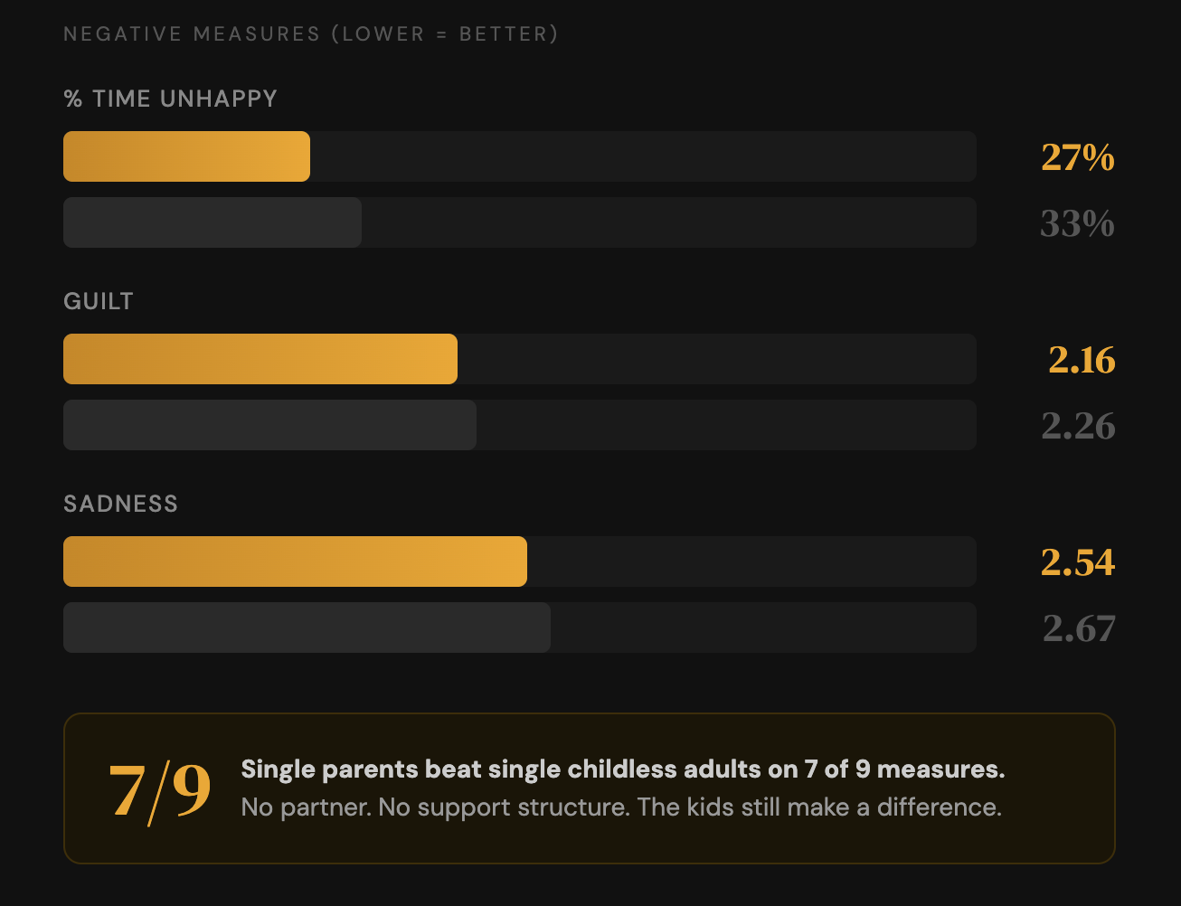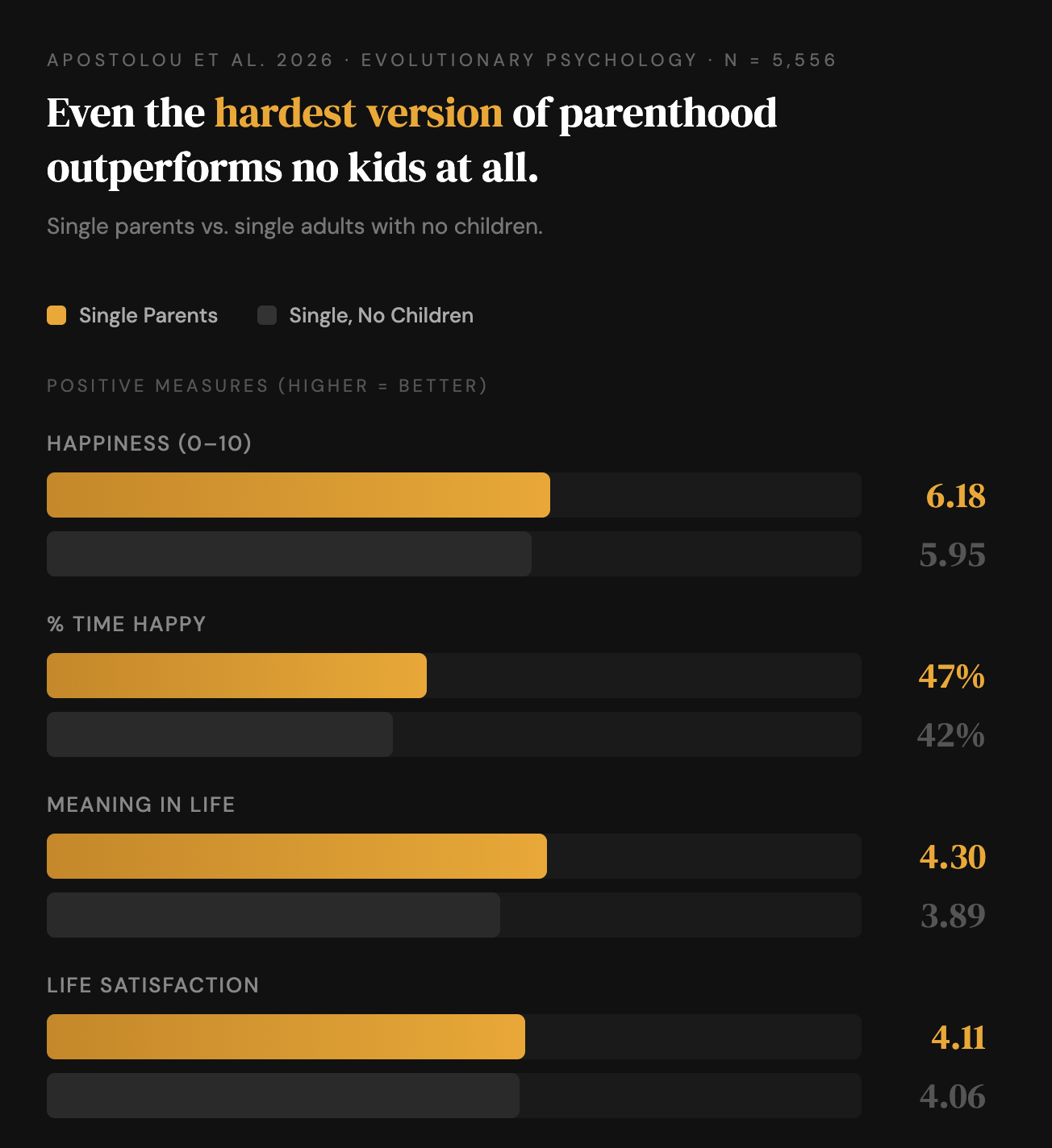 Even single parents (people raising kids alone, in the hardest possible version of the job) scored higher on meaning in life and overall happiness than single adults with no children at all. When even the broken version of the arrangement outperforms having no kids, that tells you something about how significant the thing actually is.