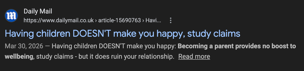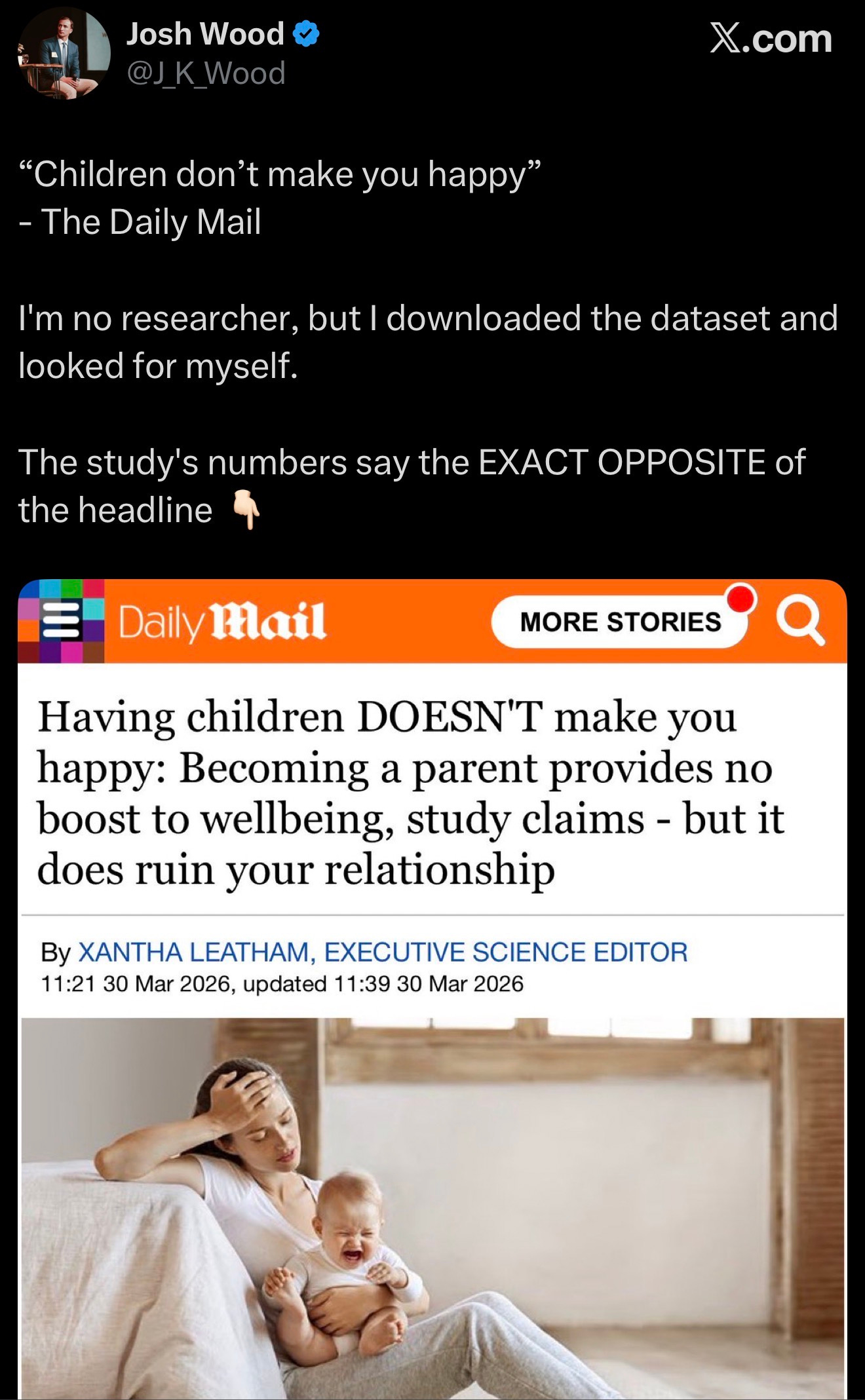 The distance between βMarried Mothers and Fathers Won Everythingβ and βCHILDREN DONβT MAKE YOU HAPPYβ is so enormous that no honest researcher and no honest journalist gets there by accident. Somebody was steering. That is a pre-written headline with the data getting squeezed until it fits.
