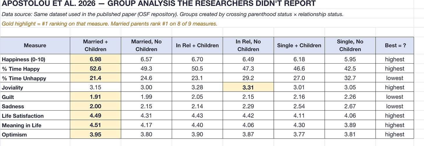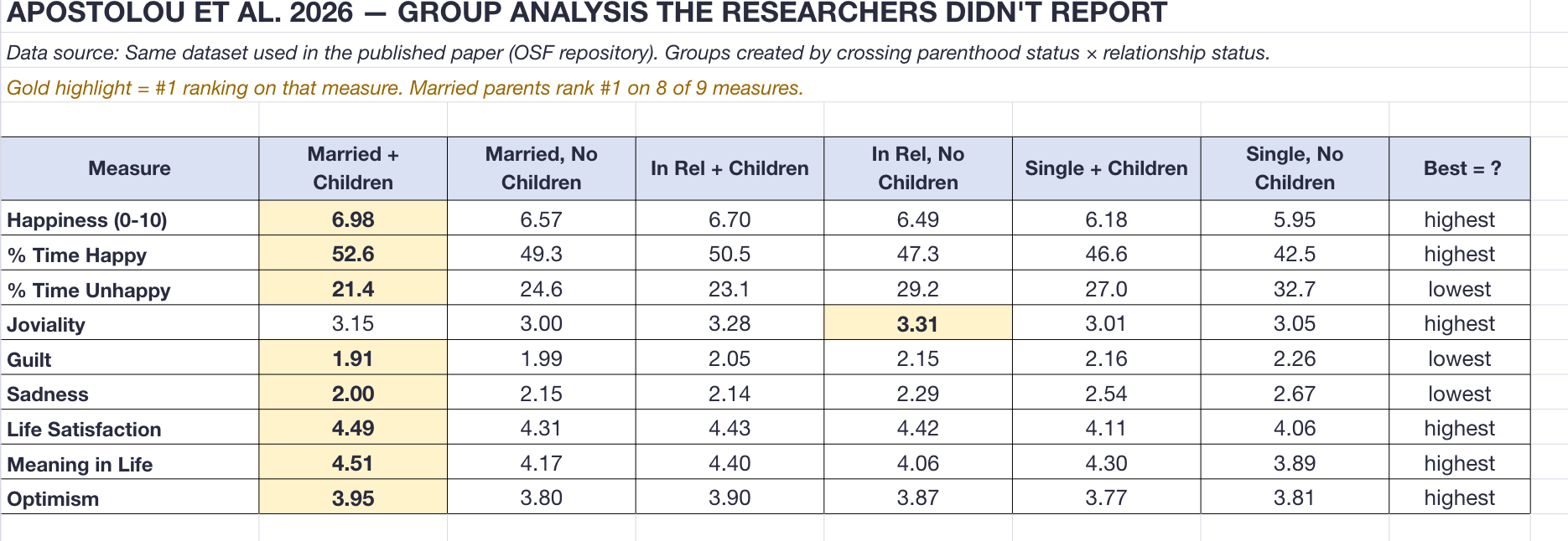 Married parents won 8 out of 9 categories. Look for yourself. It is right there in their own data. Not only that, married parents reported being happy 53 percent of the time, compared with 42 percent for single childless adults. They reported being unhappy only 21 percent of the time, compared with 33 percent for single childless adults. They topped the list on meaning, on life satisfaction, on optimism, and scored lowest on guilt and sadness.