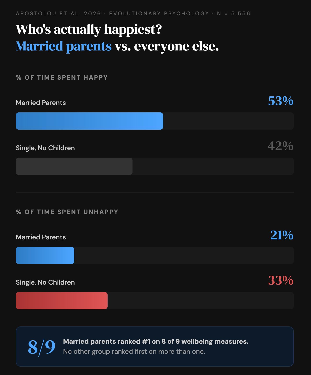 Of course parents would report slightly lower day-to-day relationship satisfaction during the years theyβre raising young kids. Raising kids can be hard on a marriage in the short term. That isnβt news, and it isnβt a scandal. The honest question is whether that fact actually matters when every other measure (meaning, overall life satisfaction, happiness, hope) moves in the right direction after children. That is the better headline: for married couples with kids the day-to-day got harder but somehow their life got better.